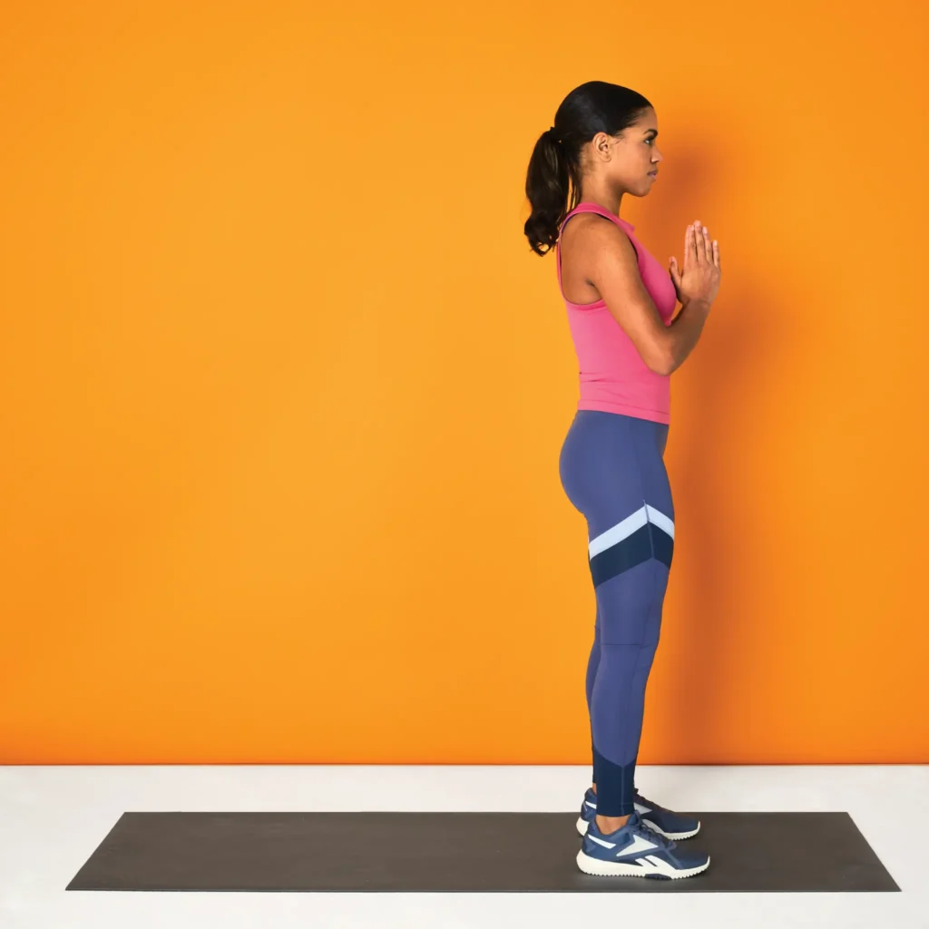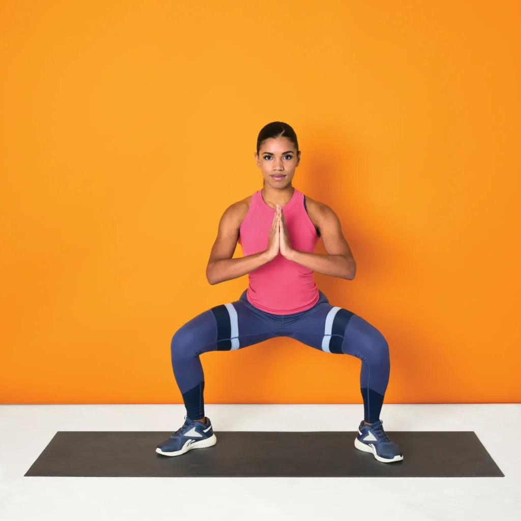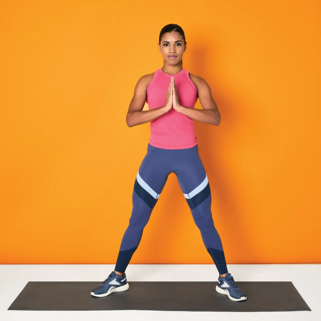 B. Step your right foot out to the right. Keep your left leg straight as your right knee bends over your right ankle. Reach your right glute back as if you’re trying to sit in a chair. Pull your navel in, then press down through your right heel to return to starting position. Do 10 times, then switch sides and repeat 10 times.