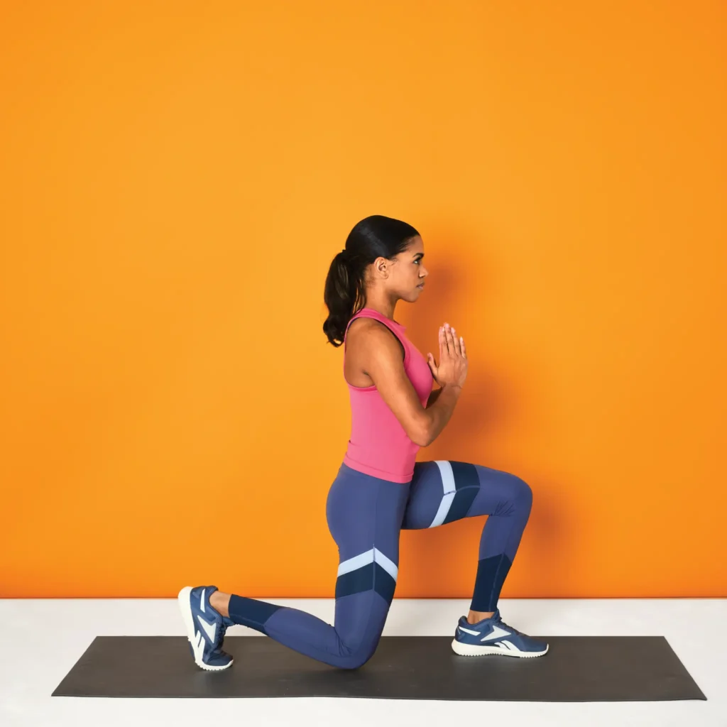 B. Step your right foot back. Lower your right knee down toward the floor and bend your left knee, making sure it’s over your ankle. Press down through your left heel and bring your right leg back to starting position. Do 10 times, then switch sides and repeat 10 times.