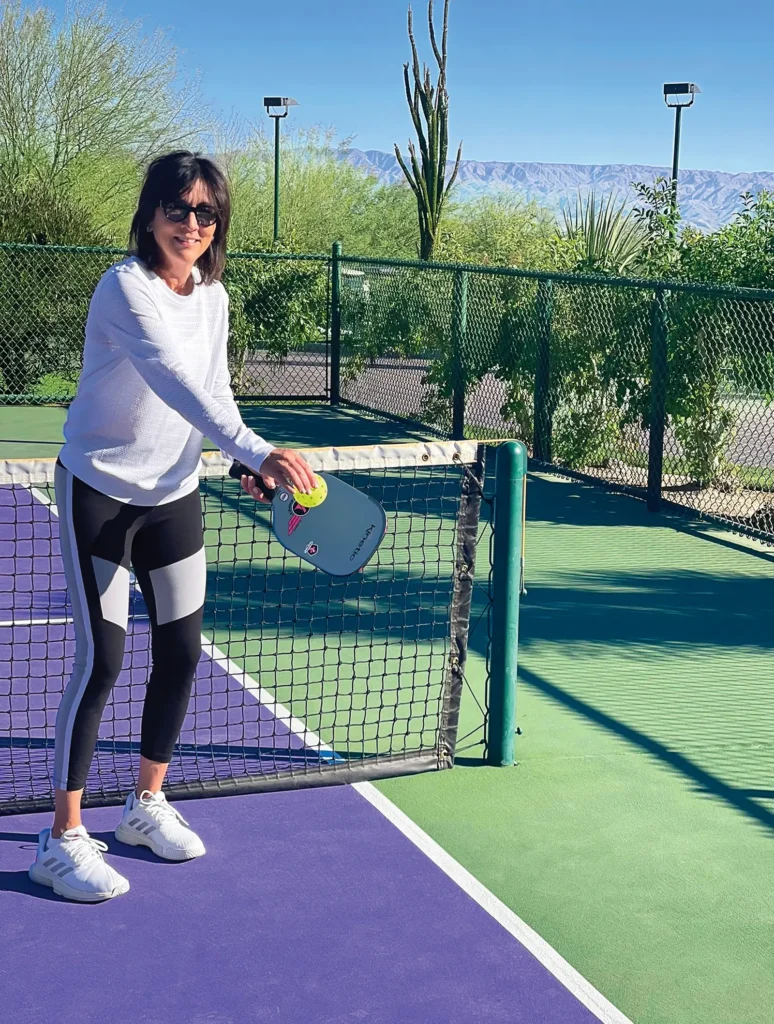 “I started playing in 2020 and fell in love. I’m the founder of the hair care company dpHUE, and I play three times a week with friends, family, even my 6-year-old granddaughter. I’m part of a group of 20 women who play every Sunday; we call ourselves The Catfight. Afterward, we socialize over snacks and margaritas. I got my colleagues hooked on it, too. My company is now the official hair care sponsor of the Minto US Open Pickleball Championships [April 23–30 in Naples, Florida]. To celebrate the partnership, we’re launching the Protect & Play Hair Mist, which protects hair against UV color fading from the sun. Playing so much pickleball in the sun, I saw that it was causing damage, but that doesn’t stop me from getting back on the court—pickleball is the highlight of my week.”