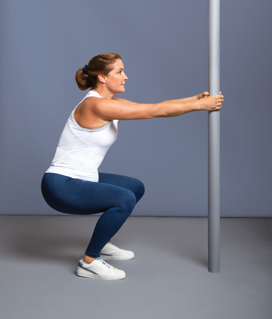 Holding on to a fence or a stationary post, squat down with a neutral spine—don’t round your back. Stretch your hips, knees, and ankles while supporting your body weight with your arms.